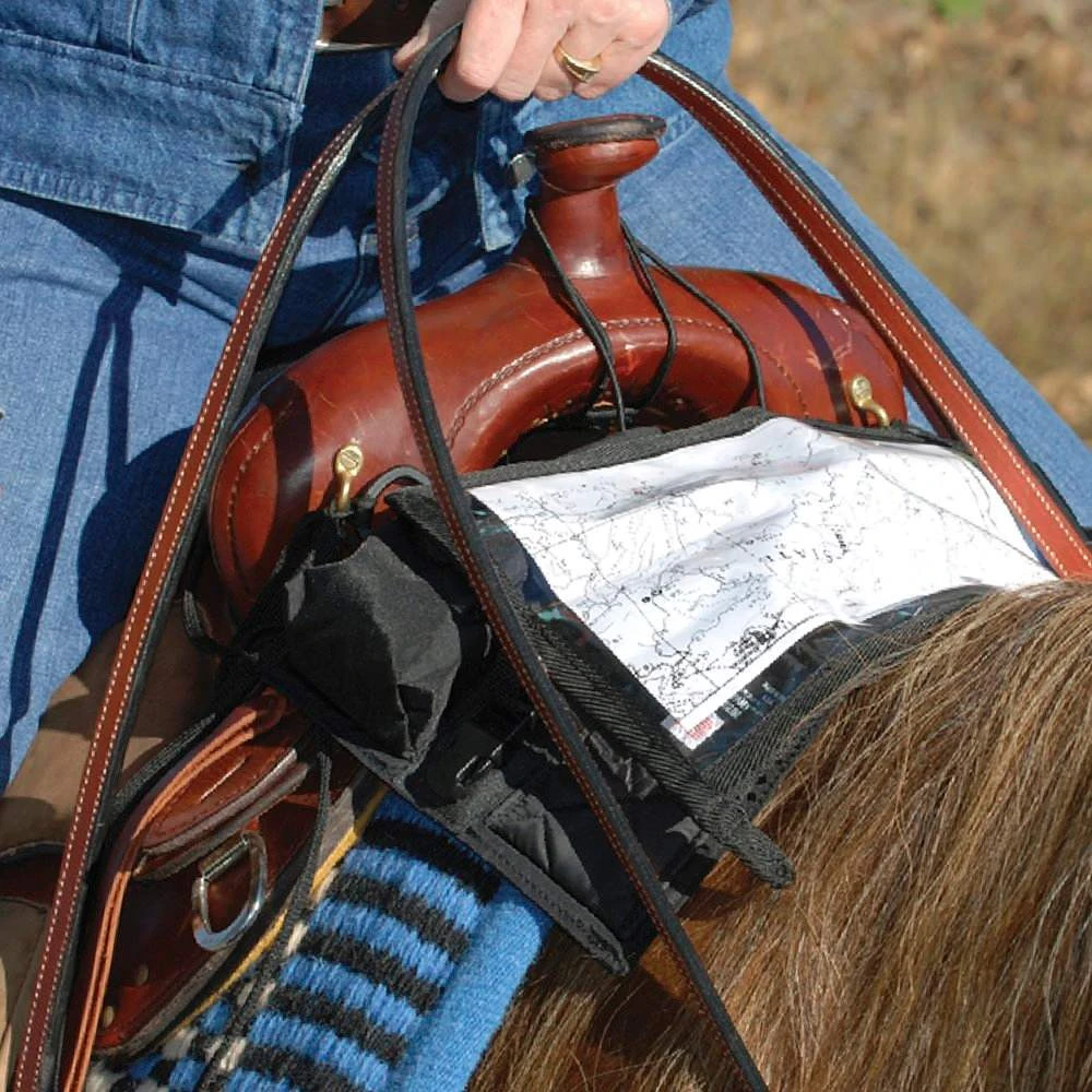 The Trail Kit ties in front of any english or western saddle and allows for one handed access to your critical items, such as sunscreen, cell phone and area map. The Trail Kit lies flat just in front of the swells of your saddle and won’t interfere with you or your horse. Complete with a double sided see-though map pocket that doubles as a waterproof cover for the contents in your kit. Includes two padded pockets for breakables and a small flashlight, pepper spray or hoof pick. Contents not included.