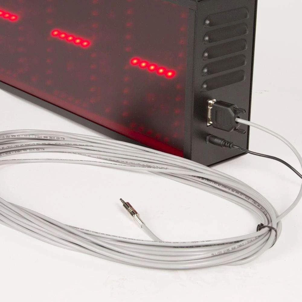 Spectator displays (Scoreboards) greatly enhance interest and participation at your barrel race, team roping, or any arena event. This scoreboard is driven by the Polaris timer console. It shows the running time and the final time. Can include a penalty or a score for roughstock events as well. The time format on the scoreboard automatically switches to match the format selected on the timer console. This scoreboard has no bulbs to burn out, is lightweight, draws very little power, and is visible even in direct sunlight!! IT can operate from an optional external battery for 10-12 hours. It can be easily computer driven and is compatible with the output from several other brands of timing equipment. The lighted digit height is 7 inches, it’s dimensions are 9″ tall x 32″wide 4″ deep, and it weighs 9 pounds. Powered by AC or optional battery power, 10 Ways. International voltage options available. Ships with 50 of cable to connect the Polaris timer console to the scoreboard.