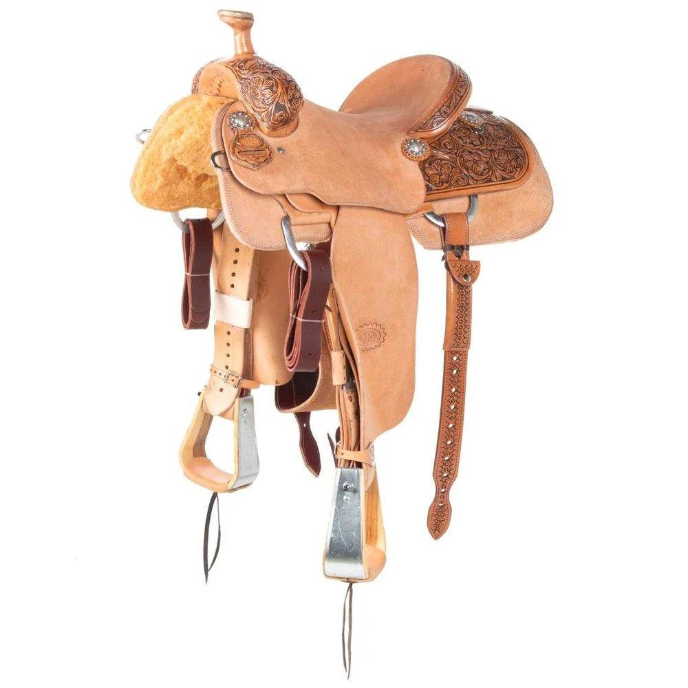 This NRS Competitor Series Team Roper has a 5 year warranty on the rawhide covered wood tree, silver floral berry conchos, metal bound wood roper stirrups, natural antiqued leather, front 7/8 drop rigging, a full toast suede quilted seat, and 90/10 wool blend lining. The seat pocket is constructed to help hold the roper in place and offer better balance effectively giving the roper every advantage.