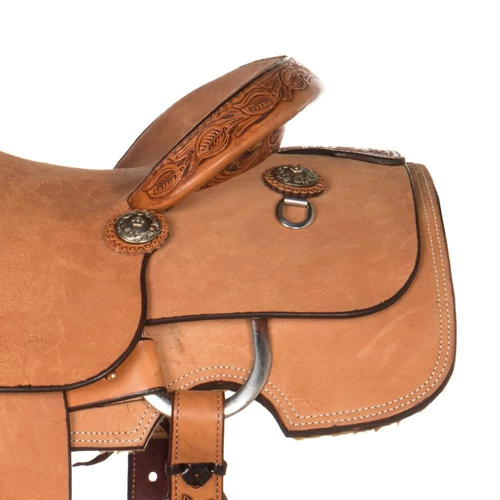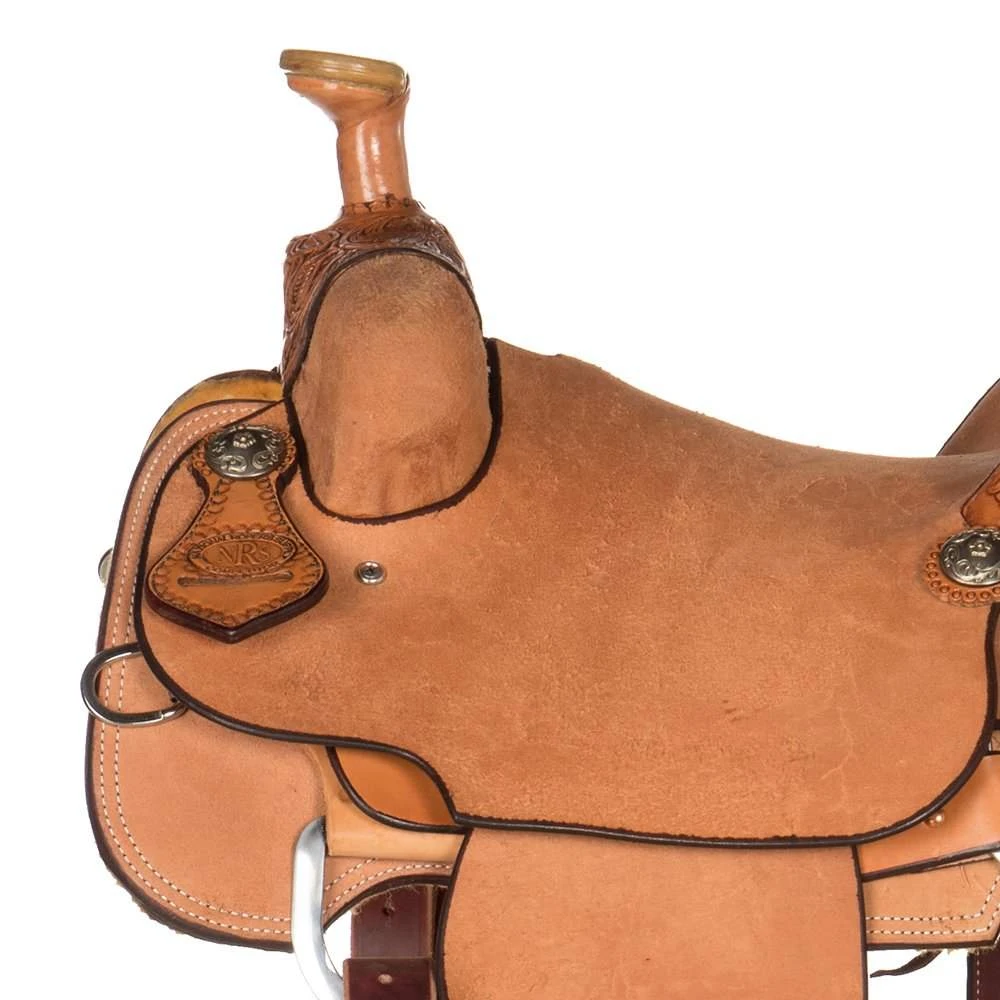 This NRS Competitor Series Team Roper has a 5 year warranty on the rawhide covered wood tree, wildfire silver conchos, tooled leather covered roper stirrups, natural leather, cheyenne roll cantle, 1/8 breed leaf tooling with antique finish, dyed edges, front 7/8 drop rigging, a hard seat, and 90/10 wool blend lining. The seat pocket is constructed to help hold the roper in place and offer better balance effectively giving the roper every advantage.