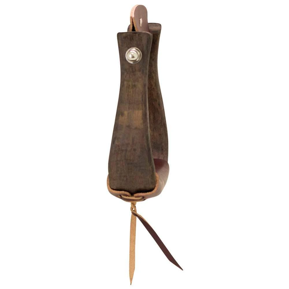 These cowboy tack Open Range 2-1/4″ Dark Wood Bell Stirrups are constructed of high quality dark wood and wrapped with dark leather. 4″ leather tassel at bottom center. Inner height measures roughly 5-1/4″ and outer height is 8-1/2″. Inner width measures 5-3/4″. 3″ Roller width. Sold in pairs.