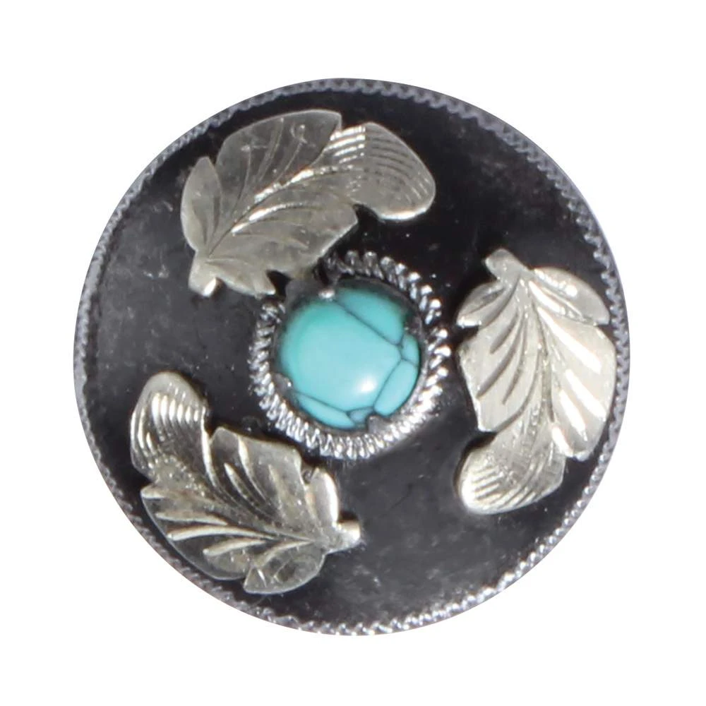 This concho from Professional’s Choice features a beautiful feather engraved design with a turquoise stone accent. 1in wide.