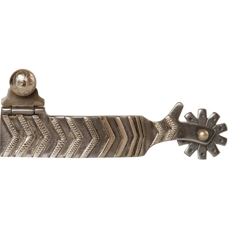 Decorative silver arrows. 1″ band, 1-3/4″ shank, blunted, engraved 10-point rowel.