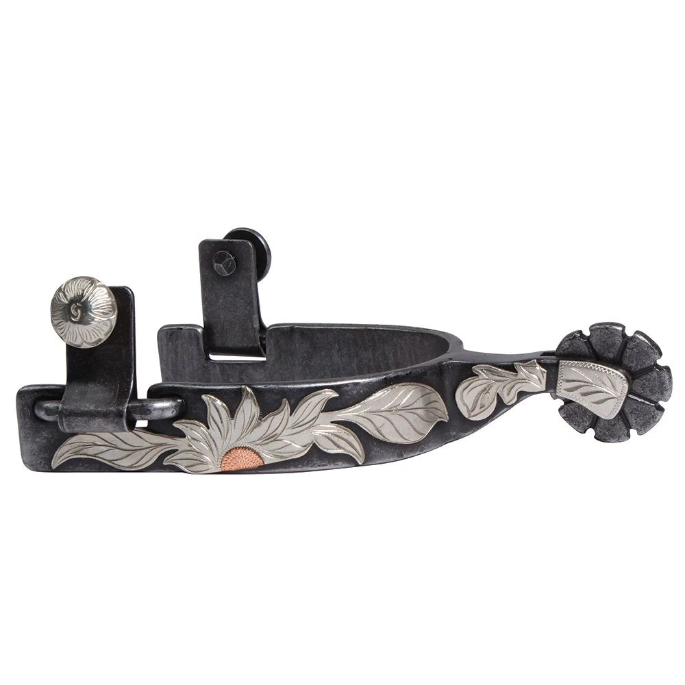 Beautiful handcrafted sunflower design on the 3/4″ band, with a blunt 8 point rowel.