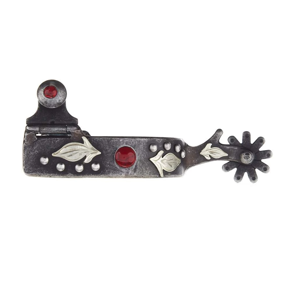 Great youth spur for any western discipline. Decorative silver feathers and red dot detail runs down the band. Ten point rowel engraved design. Features a chap guard.