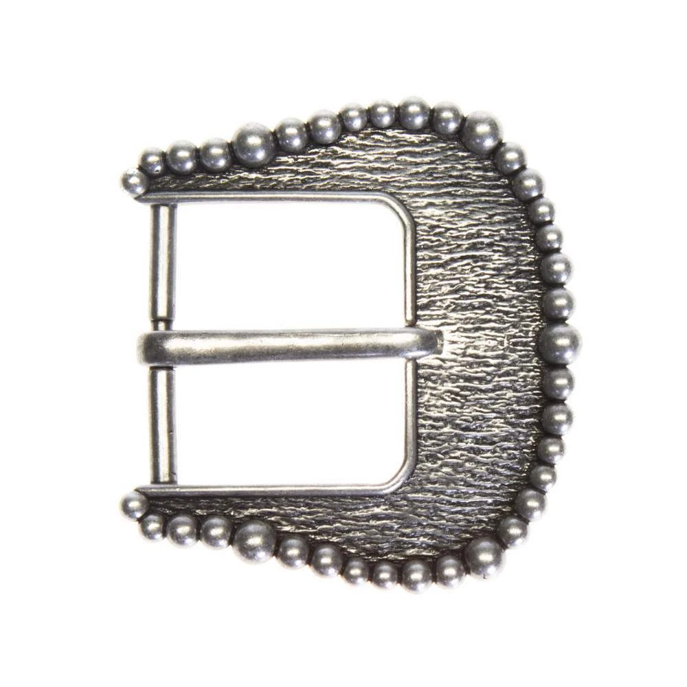 This is a hammered silver 1 1/2″ buckle with a dot border.